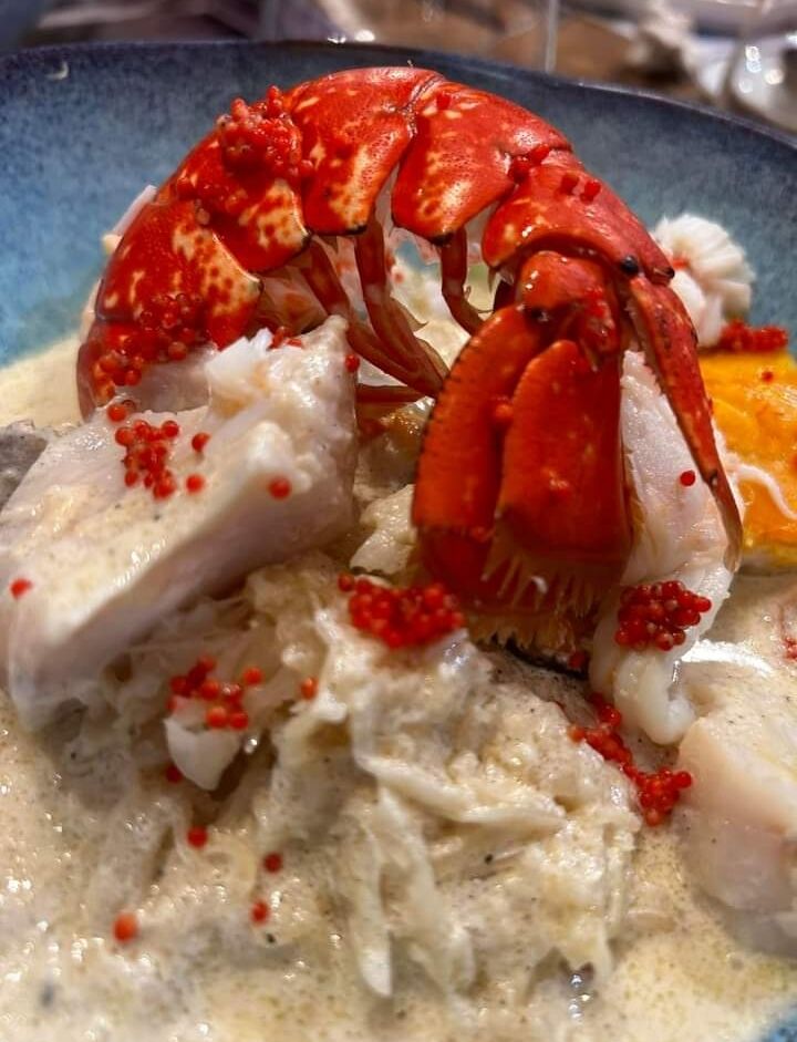 Découvrez notre choucroute de la Mer et son homard bleu décortiqué.